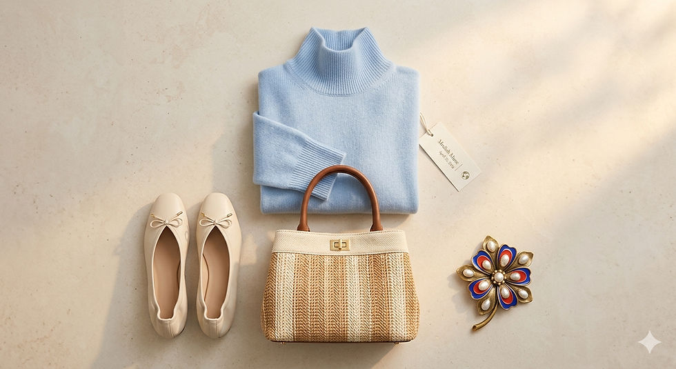 • Baby Blue, Bold Hues & The Art of the In-Between: Baby blue is the color of the moment—soft yet refreshing in funnel-neck jackets, V-neck sweaters, and woven flats. Mix it with joyful pops like tomato red or electric Klein blue for unexpected pairings. Sheer fabrics and lingerie-inspired details add a daring edge, while bandanas tied as neck scarves or headbands offer an easy, expressive accessory.